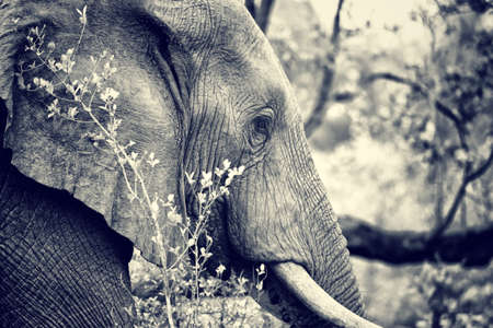 Side view portrait of big beautiful elephant outdoors, black and white photo of the wild animal, safari game drive, Eco travel and tourism, Kruger national park, Sabi Sand reserve, South Africa