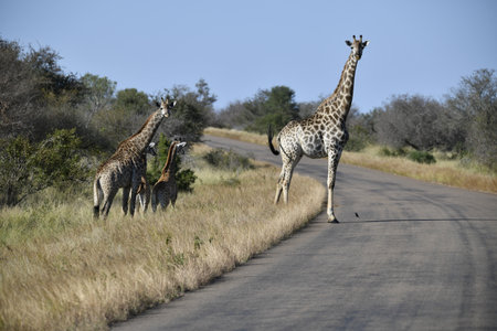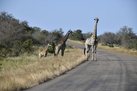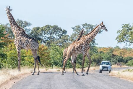 KRUGER NATIONAL PARK, SOUTH AFRICA - MAY 18, 2019: Three South African giraffes in a road. A vehicle is visible