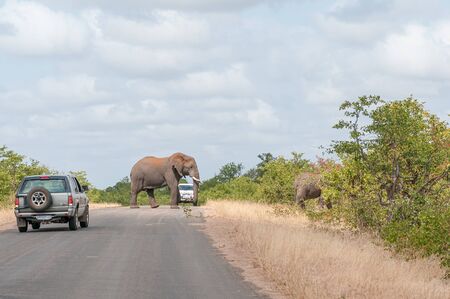 KRUGER NATIONAL PARK, SOUTH AFRICA - MAY 11, 2019: An african elephant, Loxodonta africana, with red dust on its back, crossing a road. Vehicles are visible