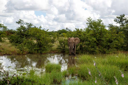 Elephant bull drinking at a waterhole in the Kruger National Park in the green season in South Africa