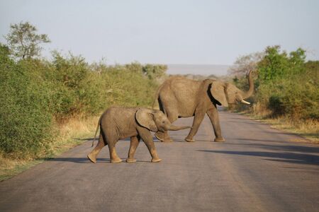 Mother and baby elephant walking across a road in the warm afternoon sun in Kruger National Park in South Africa.
