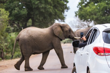 African elephants crossing the road and raising their trunk to smell the air in Kruger National Park South Africa