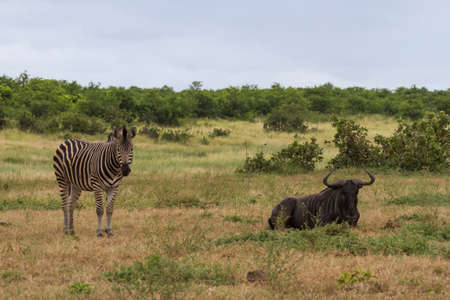 Zebra and blue wildebeest or gnu (Onnochaetes taurinus) friends relaxing together in the bushveld grasslands in Kruger National Park, South Africa with blue sky