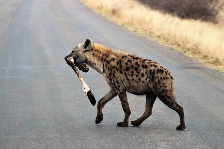 Hyena carrying a bone in its mouth