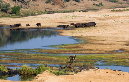 Landscape of the Letaba river bed showing buffalo and waterbuck