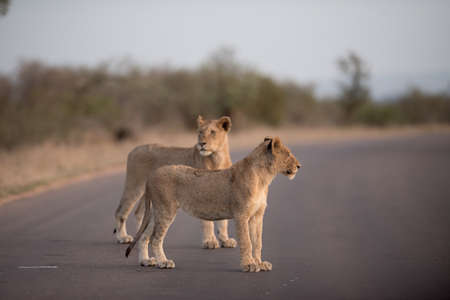 Lions relax on the street in the Kruger National Park in South Africa on safari in Mpumalanga.