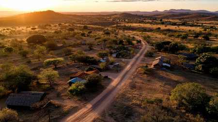 An Aerial view of peaceful rural community at sunset
