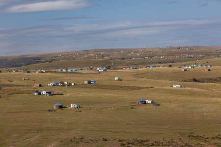 Colorful huts and housing scattered informally on steep hillside in south africa
