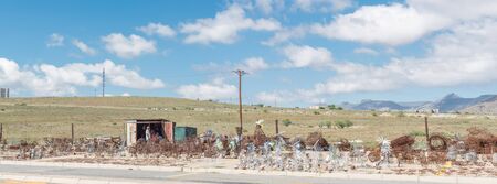GRAAFF REINET, SOUTH AFRICA - MARCH 8, 2016: A farm stall between Graaff-Reinet and Middelburg. Old farm equipment are visible