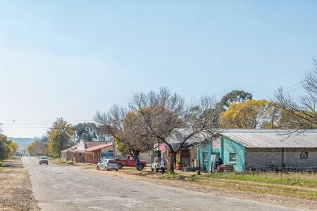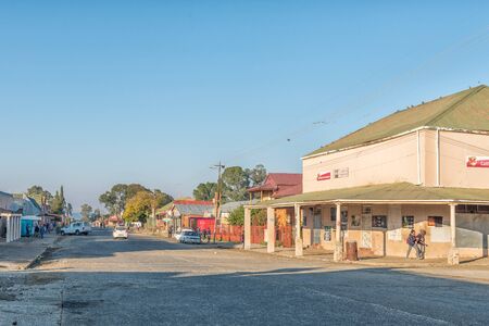 VREDE, SOUTH AFRICA - MAY 1, 2019: A street scene, with businesses and vehicles, in Vrede, in the Free State Province