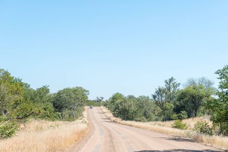 KRUGER NATIONAL PARK, SOUTH AFRICA - MAY 13, 2019: The landscape on road S52 near Shingwedzi. A vehicle is visible