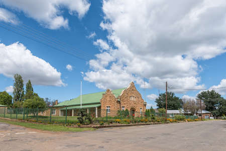 FOURIESBURG, SOUTH AFRICA - MARCH 18, 2020: A street scene, with the sandstone town hall, in Fouriesburg in the Free State Province