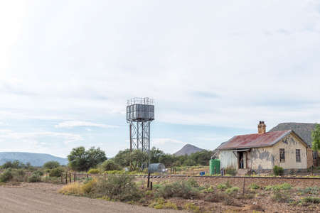 VONDELING, SOUTH AFRICA - APRIL 21, 2021: Old railway building and reservoir at Vondeling Railway Station on road R407 between Klaarstroom and Willowmore. One person is visible