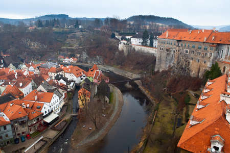 Krumlov Castle and the Czech Krumlov. Medieval fortress and the river Vltava. Red roof tiles and narrow streets. Houses made of stone.