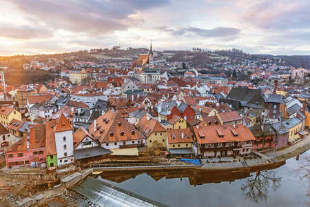 Cesky Krumlov skyline with Church of Saint Vitus and Vltava River at sunset - Cesky Krumlov, Czech Republic