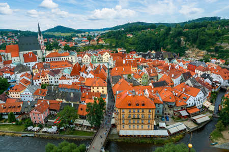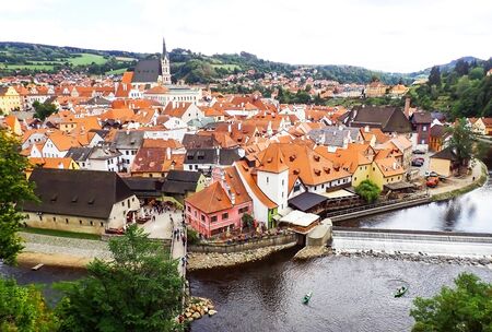 Cesky Krumlov, Czech Republic - September 4, 2021: Cesky Krumlov historical city center seen from the castle on the other side of the Vltava river.