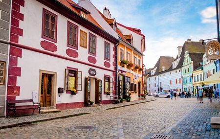 CESKY KRUMLOV, CZECH REPUBLIC.- OCTOBER, 2019: Beautiful old streets of Cesky Krumlov town, popular touristic destination
