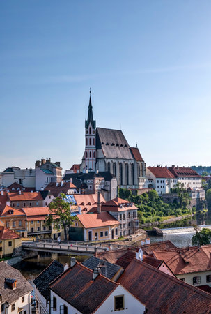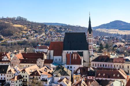 View of the Church of St. Vitus against the background of the sky and houses in Cesky Krumlov in the Czech Republic. The church is one of the main sights of the town.