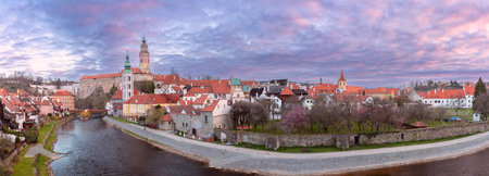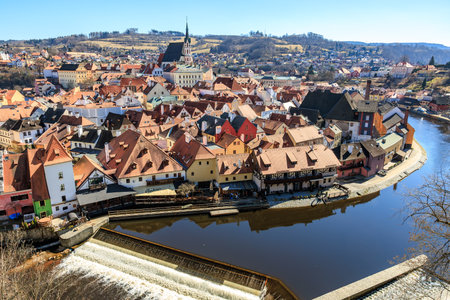 Picturesque view of Cesky Krumlov with river vltava and historic architecture. March 20, 2025, Cesky Krumlov, Czechia.