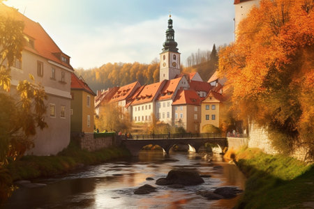Generative AI : Cesky Krumlov a famous czech historical beautiful town view to the city river and beautiful autumn street with colorful buildings and fall trees Travel european bac