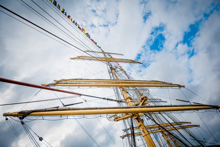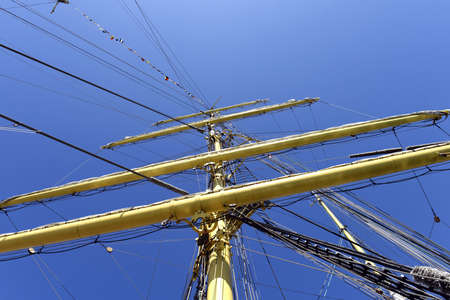 Detail of a sailboat rigging. Mast on traditional sailboats. Mast of large wooden ship.