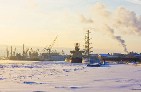St. Petersburg, ships of different kind - sailing, ice-breaker, modern vessels, etc. on river Neva in winter on ice and snow.