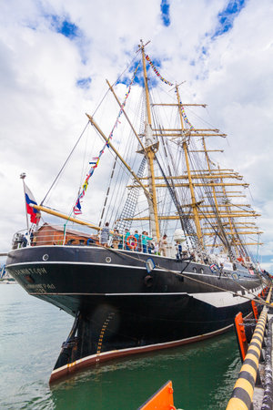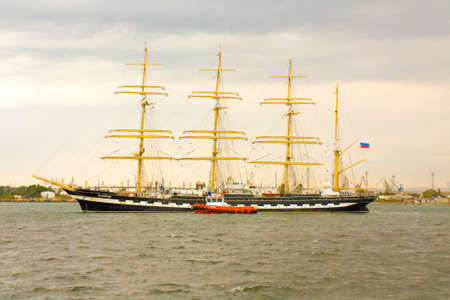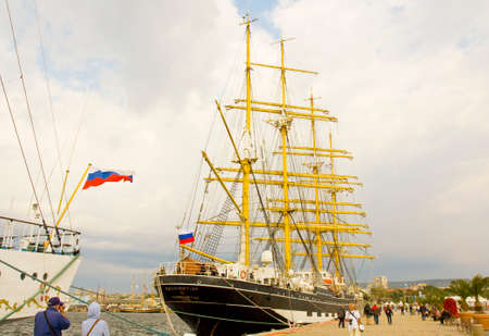 VARNA, BULGARIA - OCTOBER 4, 2016: Black Sea Tall Ships Regatta, sailing ships from different countries on international regatta, sailing ship Kruzenshtern from Russia.