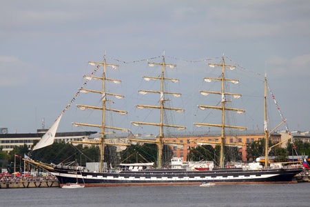 A beautiful sailing ship moored in the Neva river near the English embankment of St. Petersburg. Against the sky with beautiful clouds.
