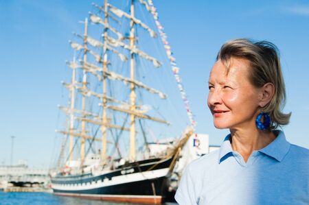 The woman on a background of a sailing vessel