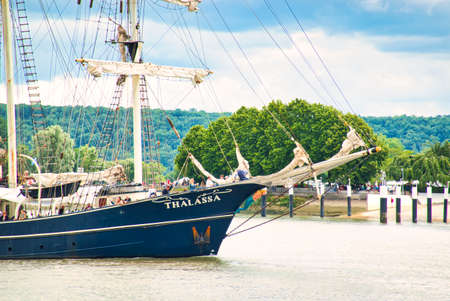 ROUEN, FRANCE - JUNE Circa, 2019. Part of the Dutch three masted schooner barquentine Thalassa on the Seine River for Armada exhibition. Luxurious sailing ship for cruise trip.
