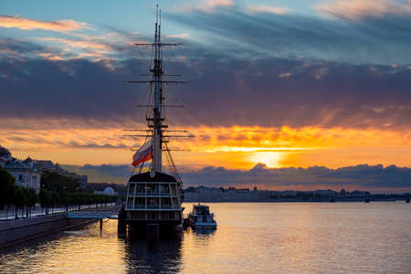 The sailing ship on the Neva river at sunset. A ship with sails against a beautiful sky. Rivers Of St. Petersburg. Beautiful sunset sky over the Neva river. Cities of Russia.