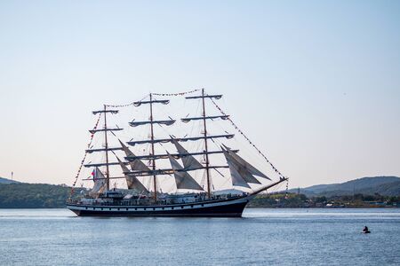 VLADIVOSTOK, RUSSIA - SEPTEMBER 11, 2018: The movement of sailing ship Pallada in the Amur Bay of the Bosporus Easern strait in the background of the Russian Island during the preparation for the sailing regatta in Vladivostok.