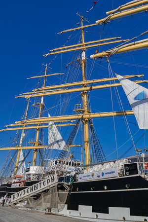 Tenerife / Spain; December 27 2019: Krusenstern four-masted barque, Russian sail training ship, moored at the port of Santa Cruz of Tenerife, Canary islands, Spain