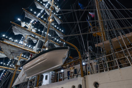 SZCZECIN, WEST POMERANIAN - POLAND - AUGUST 02, 2024: The Ecuadorian Navy sailing ship BAE Guayas at representative port quay