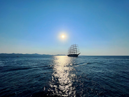 Big sailing vessel against the blue sky in the bright sunny day