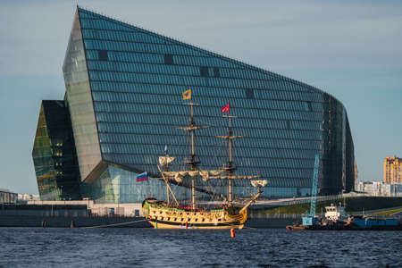 Russia, St. Petersburg, 20 May 2022: An ancient sailing frigate sails on the calm sea in sunset, the skyscraper Lakhta of the oil company Gazprom on background