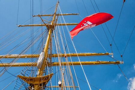 Hamburg flag in the rigging on the mast of a sailing ship