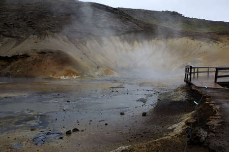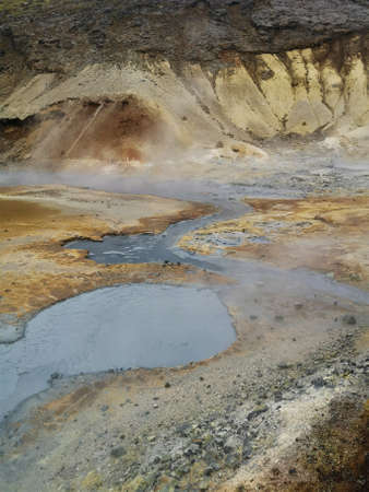 Geothermal area, hot steam, solfataras and hot gray mud cauldrons. Krisuvik, western Iceland. Reykjanesfolkvangur Peninsula.