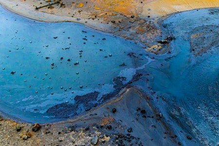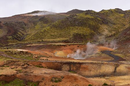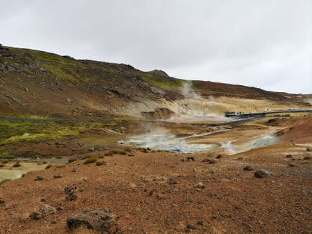 Krisuvik / Iceland - August 15, 2017: Geothermal manifestations in Krisuvik geothermal area, Iceland, Europe