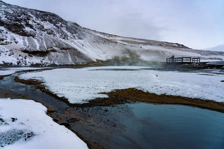 warm river water and mountains in snow in krysuvik seltun on reykjanes peninsula in Iceland winter landscape