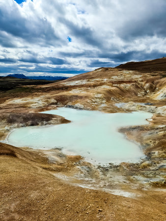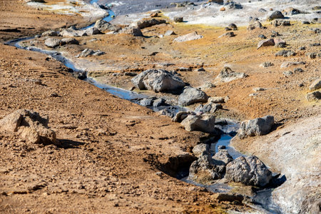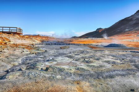 Natural landscape of Namafjall geothermal area near lake Myvatn in north Iceland in summer sunny day.