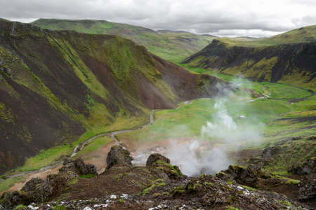 Hot river valley Rekjadalur with steamy water September 2018
