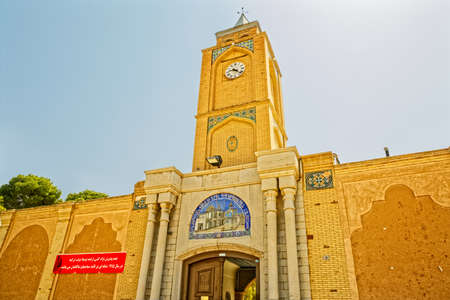 Shiraz, Iran - 29 October, 2018: Wonderful details of Persian exterior of the Shah Cheragh Mosque and Mausoleum. Walls decorated with colorful mosaic. Gorgeous chandeliers. Islamic architecture.