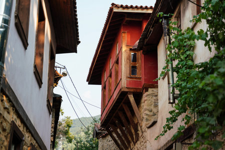 BURSA, TURKEY - SEPTEMBER 01, 2018 : 700 years old Ottoman village Cumalikizik. It is popular with small tiny wooden and traditional houses and shops around cobblestone streets.