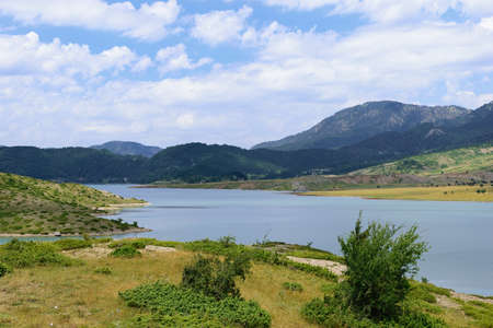 Water reservoir landscape with mountains, Dimcay, Alanya, Antalya, Turkey. Vacation holiday recreation, travel concept
