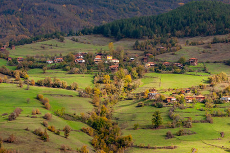 Aerial sunset view of village of Yavrovo with Authentic nineteenth century houses, Plovdiv Region, Bulgaria