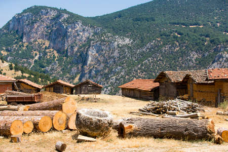 Old adobe barns of Bursa, Turkey with scenic background