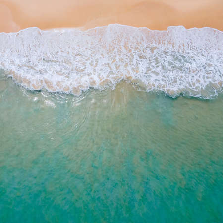 Aerial view of turquoise ocean wave reaching the coastline. Beautiful tropical beach from top view. Andaman sea in Thailand. Summer holiday vacation concept