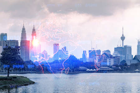 Glowing hologram of Earth planet map on aerial panoramic cityscape of Kuala Lumpur at sunset, Malaysia, Asia. The concept of international business in KL. Multi Exposure.