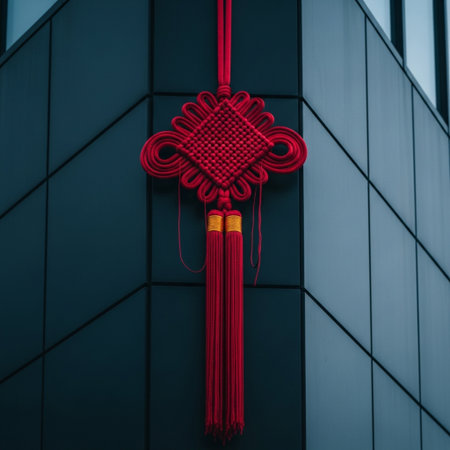 An extreme Hero Detail shot focusing on a traditional deep crimson silk knot or tassel used for Luna